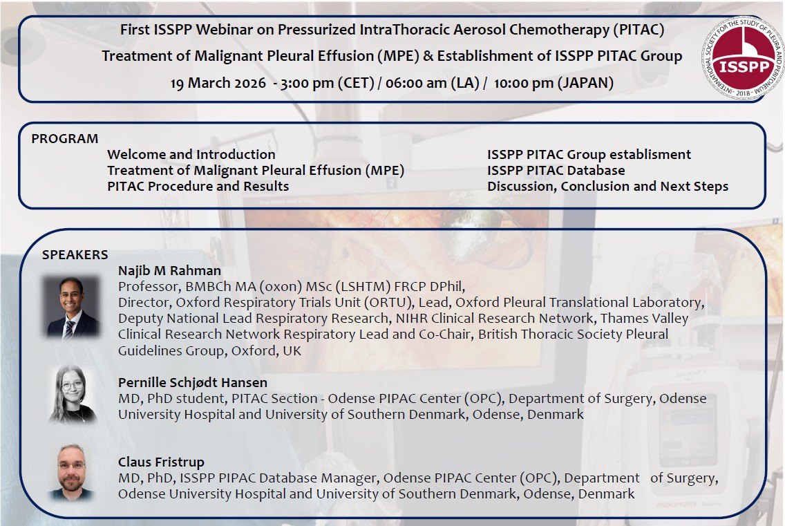 Treatment of Malignant Pleural Effusion (MPE) & Establishment of ISSPP PITAC Group. REGISTRATION: Mail to Jette.Bang.Hedelund@Rsyd.dk (Just write “Webinar”)